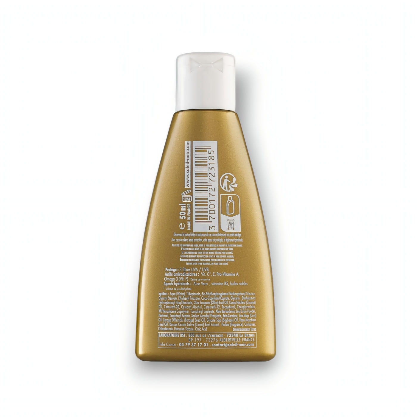 Since 1978, Soleil Noir has combined solar technology and beauty to enhance skin. A pioneer, the brand has incorporated Hyaluronic Acid and Collagen into its skincare products, combined with anti-aging complexes, Multivitamins, and Aloe Vera. Protected by a patent, this exclusive formula provides hydration, long-lasting protection, and a natural glow.