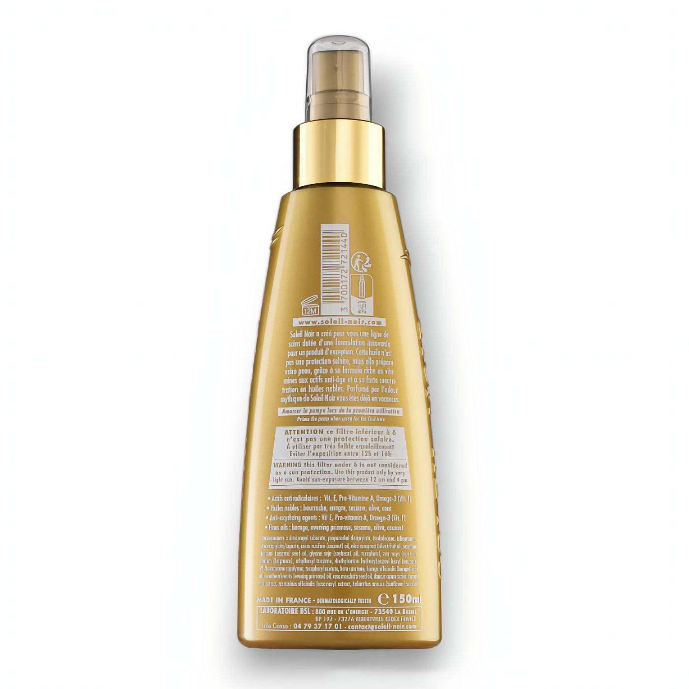 Soleil Noir a créé pour vous une ligne de soins dotée d’une formulation innovante pour un produit d’exception. Cette huile n’est pas une protection solaire, mais elle prépare votre peau, grâce à sa formule riche en vitamines aux actifs anti-âge et à sa forte concentration en huiles nobles.
